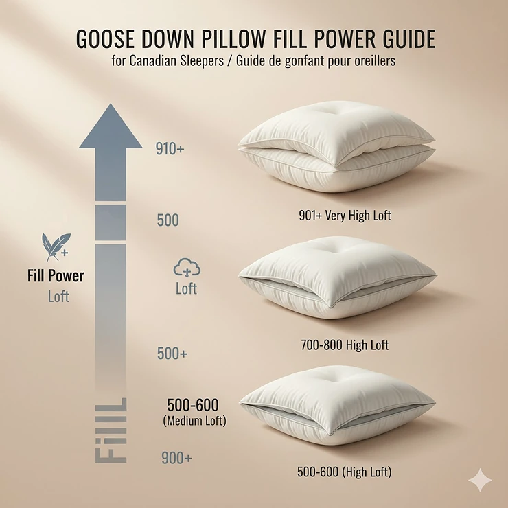 Beware of impossibly low prices. Genuine goose down costs money to source and process. A “goose down” pillow priced at $30 CAD likely contains minimal down or uses lower-quality materials. Quality options start around $85-$100 CAD for standard sizes.
